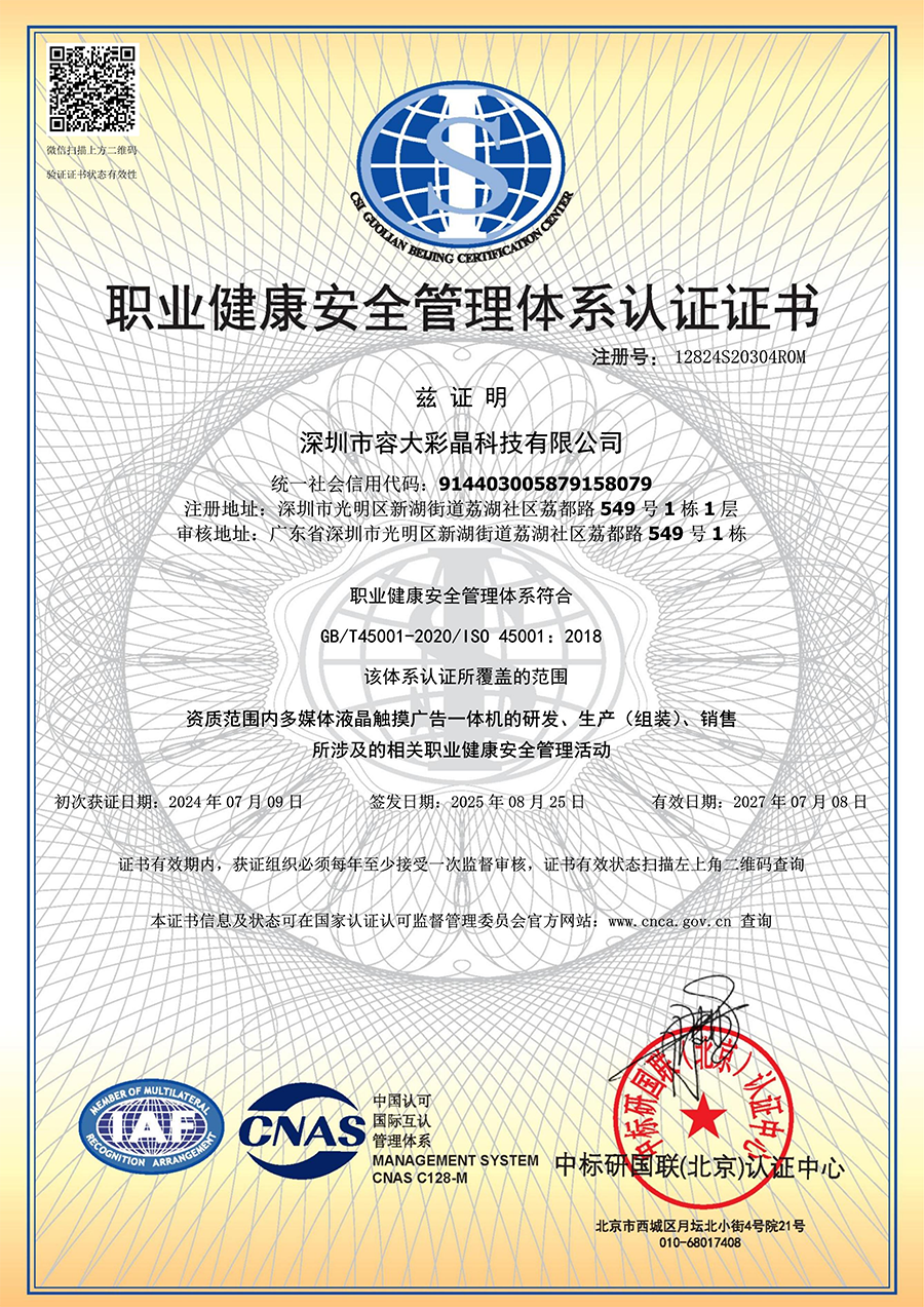 深圳市容大彩晶科技有限公司董事長/朱忠敬先生表示:“員工是我們最寶貴的財(cái)富。他們的健康和安全永遠(yuǎn)是公司的頭等大事。獲得ISO 45001認(rèn)證不僅僅是為了滿足標(biāo)準(zhǔn)要求,更是我們企業(yè)文化內(nèi)核的體現(xiàn)。它證明了我們?yōu)槊恳晃粏T工創(chuàng)造一個(gè)安全、健康、體面工作環(huán)境的堅(jiān)定承諾。這將為公司的穩(wěn)健運(yùn)營和長遠(yuǎn)發(fā)展奠定堅(jiān)實(shí)的基礎(chǔ)。”